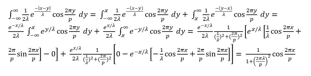 Basically, it states that the effect of convolving the exponential function with a sinusoidal function is to effectively reduce the amplitude of that sinusoidal function by a factor of 1/(1+(2 pi lambda/pitch)^2), where lambda is the decay distance of the exponential function. The convolution for the difference of two exponential functions is simply the difference of the separate convolutions of the individual exponential functions.