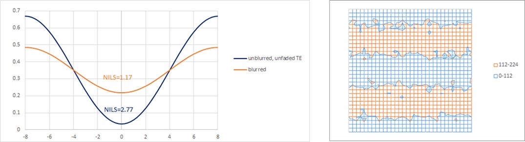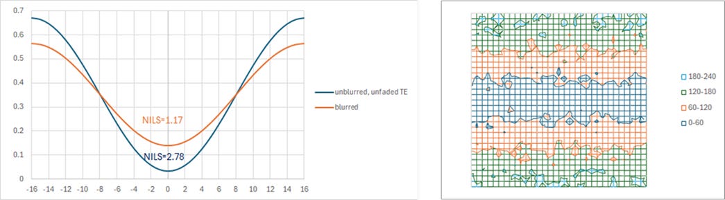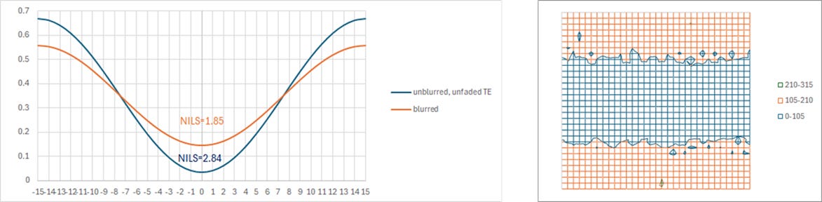 Figure 4. The electron blur function of Figure 1 reduces the NILS for 8 nm linewidth on 32 nm pitch. Note that a two-beam image is used assuming maximal depth of focus. The stochastic image of electrons/nm2 (right) assumes a 20 mJ/cm2 absorbed dose with a nominal electron/photon ratio of 8 (can vary from 7 to 9).