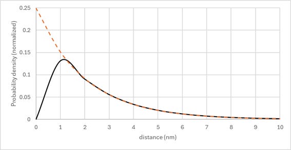 Figure 1. The exponential function (orange) has an unrealistic peak probability at zero distance. Subtracting an exponential function preserves the long-distance behavior but gives a more accurate representation of the photoelectron mean free path ~ 1 nm. Here the difference of exponential functions is shown in black. The orange exponential function is 0.25/nm exp(-x/2 nm), while the subtracted exponential function is 0.05/nm exp(-x/0.4 nm).