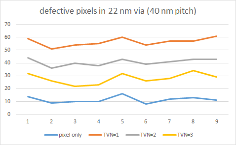 Figure 3. The number of defective pixels in a 22 nm via (40 nm pitch) decreases with increasing threshold vicinity number (TVN). Exposure and resist conditions given in text.