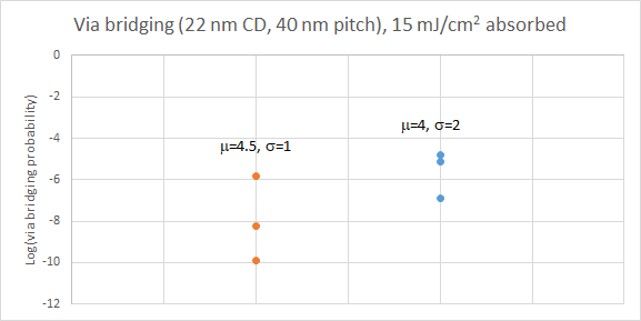 After posting, this paper by Samsung and ASML from 2025 came to my attention, confirming the same >ppm-level results that I reported: https://www.spiedigitallibrary.org/conference-proceedings-of-spie/13426/134261Z/The-sub-ppm-level-of-stochastic-failure-model-for-random/10.1117/12.3050663.short Also observed two orders of magnitude failure probability variation across patterns at nominal condition. Defects with sub-ppm level failure probability could contribute to yield loss.