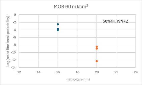 Figure 7. Resist line break probability for metal oxide resist (MOR) at 60 mJ/cm2(two-beam imaging). The thickness is taken to be equal to the pitch. The blur is assumed to reduce contrast by 26% for 40 nm pitch, 35% for 32 nm pitch. The electron number per photon is a random integer from 4 to 8 (uniform distribution).