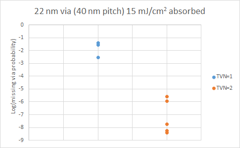 A missing via can be expected to arise when the number of defective pixels contained within the via is enough to occupy a sufficiently large enough fraction, e.g., 70% [6], of the via area. A 22 nm via on 40 nm pitch square array is modeled as the anchor feature for a 3nm via layer, as in [6]. A dose of 89 mJ/cm2 (based on Figure 1) is incident under quadrupole illumination (4-beam imaging) on 50 nm positive-tone chemically amplified resist (CAR), but only the bottom 40 nm remains to keep the image, due to resist loss increasing with dose [10] from outgassing [11] and other mechanisms. The electron yield per photon is modeled as a normal distribution with mean of 4.5 and standard deviation of 1, and the acid yield per electron is fixed at 1. The combined electron and acid blur is taken to reduce the contrast of a sinusoidal image by 48% for 40 nm pitch and 76% for 28 nm pitch.