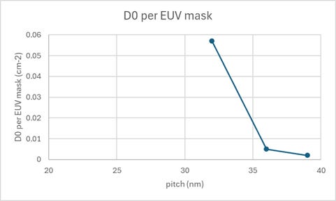 where systematic yield is an estimated value (98%) and random yield is given by the Poission model exp(-A*D0), with A being the die area (here taken to be 1 cm2), and D0 being the defect density. Since some layers require more than one mask, D0 would be the product of the defect densities per mask use. Since EUV stochastic effects get worse with smaller pitch, the corresponding D0 per use of EUV mask increases with pitch. In fact, there is a cliff that starts just below 40 nm pitch (Figure 1).