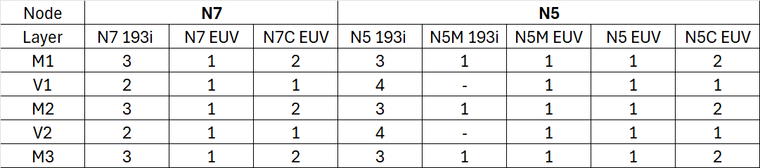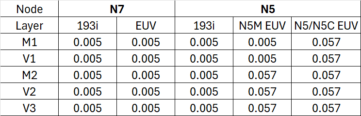 Note that there are several versions of 5nm nodes. N5M applies both 193i and EUV for metal patterning (one mask each), while N5 EUV applies EUV only (single exposure patterning) and N5C EUV adds an EUV cut mask for metal patterning. Likewise, for 7nm, N7C EUV is N7 EUV with an EUV cut mask added for metal patterning. N5M EUV has better D0 per mask due to a more relaxed M1 pitch (equal to gate pitch), while N5 EUV and N5C EUV used tighter M1 pitch, effectively a shrink compared to N5 193i and N5M.