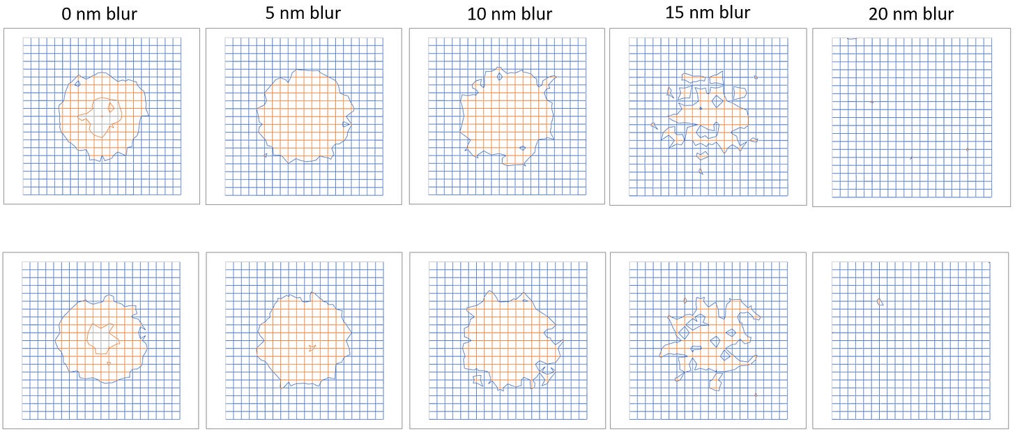 While optical sources of blur, such as defocus, flare, and EUV dipole image fading [2], can be considered as independent of wafer location, non-optical sources, such as from electron migration or acid diffusion, can have a locally varying behavior. It is therefore important to have some way to characterize and/or monitor the local blur in a patterned EUV resist. The most straightforward way is to have a resist pattern that covers the whole exposure field with adequate resolution-scale sampling. A practical choice for a 0.33 NA EUV system would be a 20 nm half-pitch hole or pillar array, which gives equal sampling in x and y directions. It is also practically at the resolution limit for contact/via patterning due to stochastic variations [3,4]. As shown for an example in Figure 1, a large enough blur, e.g., 20 nm, is enough for the contact to go missing. Such a large blur may result from local resist inhomogeneities as well as occasionally large electron range.