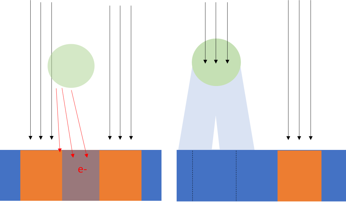 Left: A nanoparticle located near the resist surface, releasing secondary electrons into the region between exposed features, causing a merging feature defect. Right: A nanoparticle located near the resist surface, reducing EUV exposure dose locally by shadowing, causing a missing feature defect. Note that an Arago bright spot [11] forms in the center of the shadow, but this is not enough to compensate the exposure.