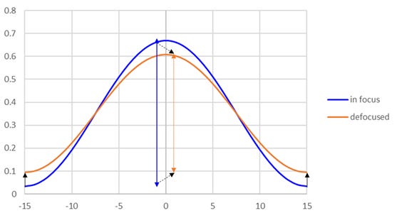 Figure 1. Defocus reduces the peak-valley difference and adds an offset to the minimum dose level. This tends to increase vulnerability to stochastic fluctuations.