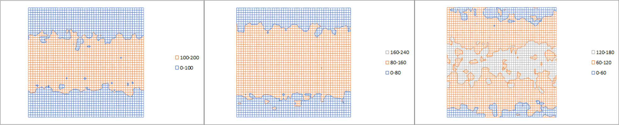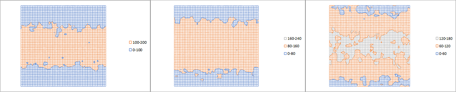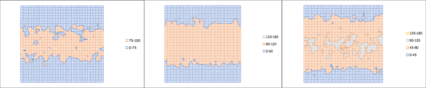 Figure 3. 30 nm pitch, 40 mJ/cm2 absorbed, 3 nm blur, 33 e/nm^2 from non-EUV sources. Pixel-based smoothing (rolling average of 3x3 0.6 nm x 0.6 nm pixels) is applied. Numbers plotted are electrons per 0.6 nm x 0.6 nm pixel.